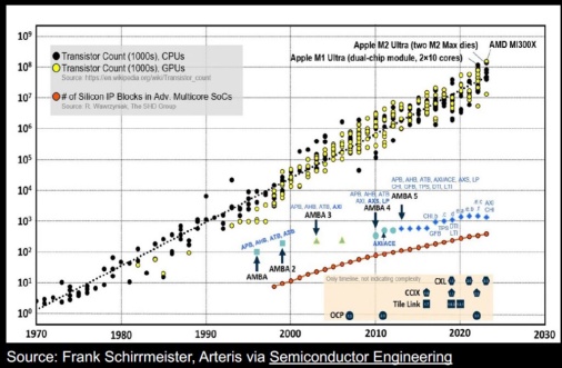 作为其中的一部分,Baya Systems的首席商务官 Nandan Nayampally 展示了下面显示的图表,黑点和黄点分别代表 CPU 和 GPU 中的晶体管数量,有趣的是红点,它们反映了高级多核 SoC 中的硅 IP 块数量。请记住,Y 轴是对数的,这表明 20 世纪 90 年代末的平均 IP 数量不到 10 个,但现在已达到数百个,并且仍在增加。同样有趣的是无数 AMBA 协议的时间线并列,包括各种 AXI 和 CHI。