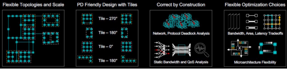 Weave IP 与 WeaverPro 的结合带来了统一的设计流程。智能数据驱动的统一结构的优势包括优化性能和面积的通用传输机制、拓扑和规模的广泛灵活性、通过构造进行纠正(无死锁、QoS、RAS)以及基于工作负载的局部和全局优化。