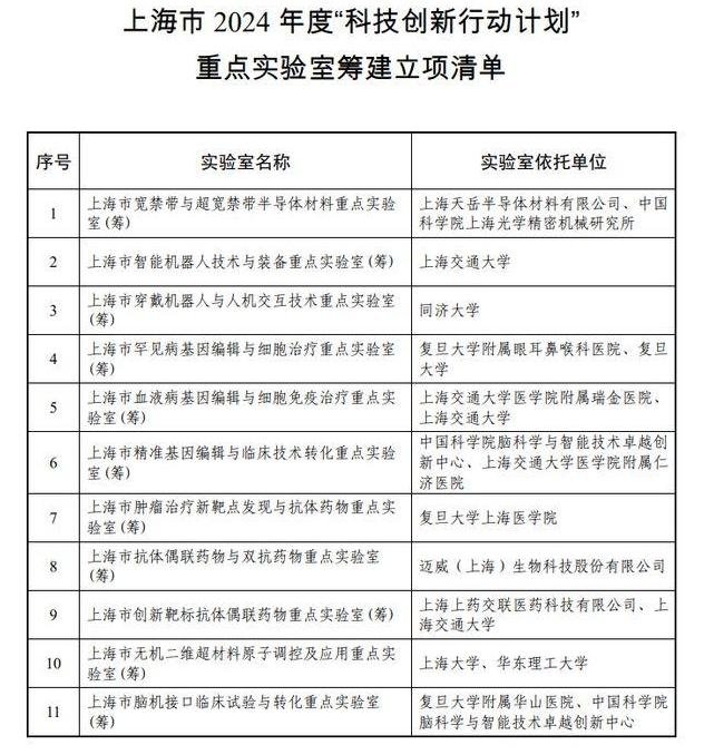 以下为上海市2024年度“科技创新行动计划”重点实验室筹建立项清单: