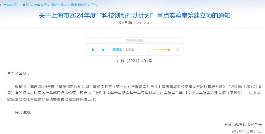 近日,上海市科学技术委员会发布通知,根据《上海市2024年度“科技创新行动计划”重点实验室(第一批)申报指南》与《上海市重点实验室建设与运行管理办法》(沪科规〔2022〕6号)有关规定,协同各推荐部门评审论证,现启动“上海市宽禁带与超宽禁带半导体材料重点实验室”等11家重点实验室筹建立项。