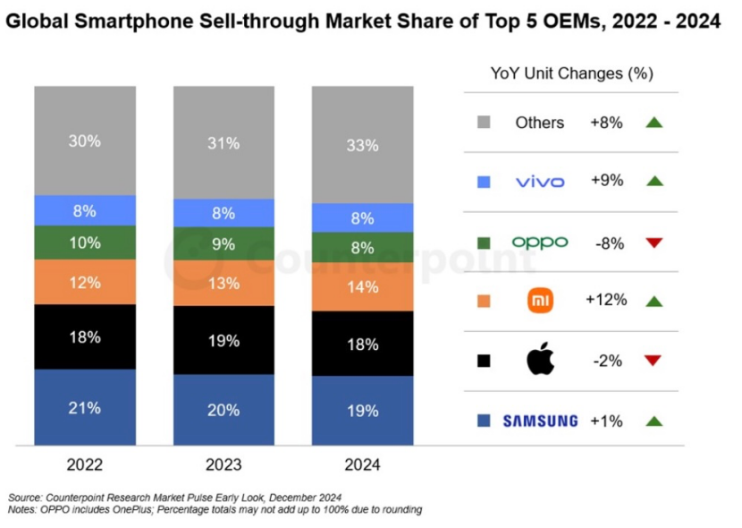 小米在2024 年以成长最快的品牌,稳居第三,得益于产品线优化、高端市场布局及积极的全球拓展策略。
