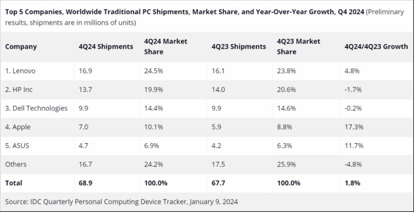 在品牌方面,联想继续领跑全球PC市场,2024年全年出货量比前一年增加4.7%,市场份额达到了23.5%,稳坐头把交椅。