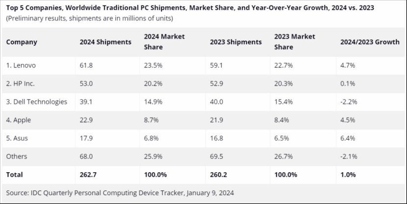 根据IDC的数据,2024年全球PC出货量为2亿6270万台,同比增长1%。尽管增幅微小,但这是三年来首次实现增长。