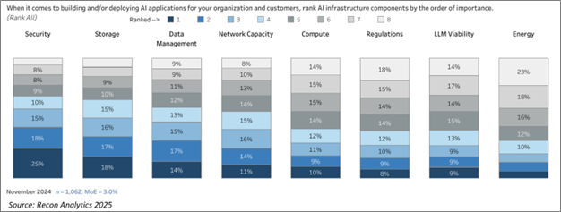 在调查中,受访者表示在基础设施优先事项中,安全性是最关键的,25%的受访者将其列为首位。存储容量则排在第二位,占比18%。其他重要的基础设施问题还包括数据管理、计算资源、网络容量和法规合规性。