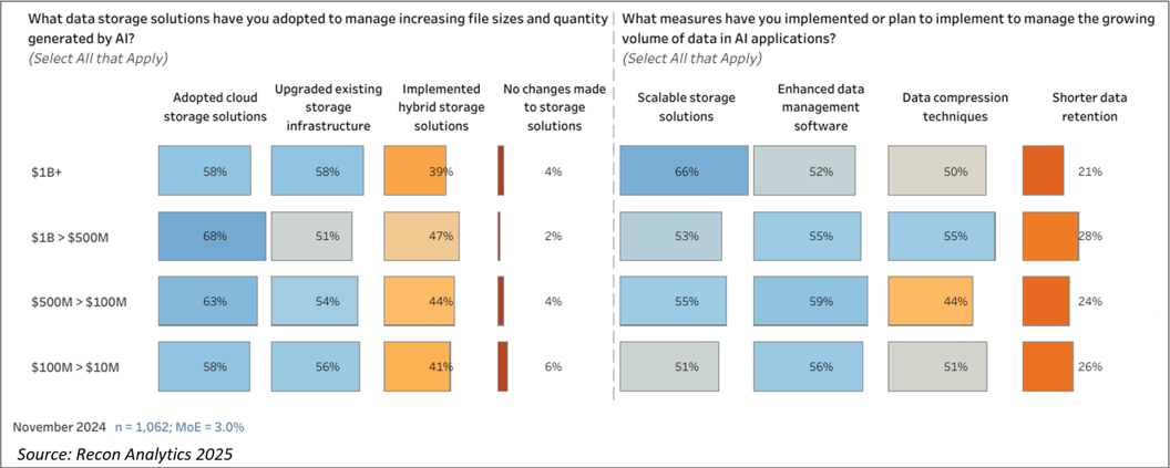 其中,46%的受访者认为现有的数据存储方法不足以满足需求,正在采用额外的数据存储解决方案来管理AI生成的文件。而在这其中61%的受访者选择了可扩展的云存储解决方案,55%选择了升级现有的基础设施,56%采用了增强的数据管理软件,49%实施了数据压缩技术来管理AI生成的海量数据。