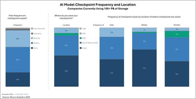 73%的受访者表示,AI正在推动数据存储的增加,因为他们每天或者每周都在备份之前保存的检查点数据。对于每天保存检查点的公司,32%表示会保留这些数据超过12个月,而29%会保留6到12个月。在使用超过100PB存储容量的组织中,87%的企业将AI训练检查点保存在云环境或硬盘和固态硬盘的组合中。频繁的检查点保存是常见做法,28%的公司每天保存,43%的公司每周保存。这都增加了对存储的需求。