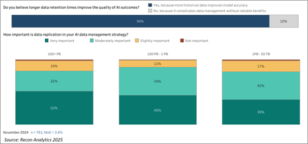 数据复制已成为确保数据完整性和优化AI结果的另一种策略。约80%的受访者认为复制对他们的AI战略重要,尤其是在存储容量较大的组织中。使用超过100PB存储容量的公司,52%认为数据复制对于维持其AI模型的准确性和可靠性至关重要。