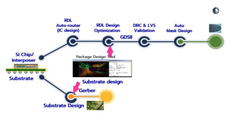 对于 FOCoS 设计,当收到网表或相对坐标时,使用传统封装设计工具通常需要数周时间才能完成 RDL 布线。但是,通过利用自动布线器和 IC 设计工具,可以将总中介层布局设计周期缩短 50% 或更多。此外,自动掩模生成器将 RDL 掩模的设计交付周期从三天显著缩短至不到一小时。