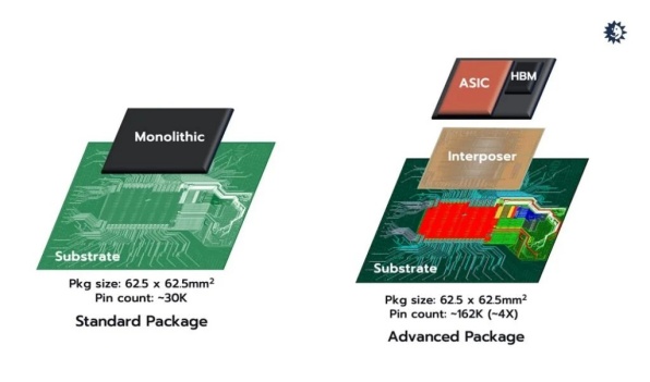 例如,如下图所示,单片芯片的标准 FCBGA 封装尺寸为 62.5 x 62.5 mm²,具有约 30,000 个 I/O 引脚。相比之下,当使用芯片组(例如一个 ASIC 芯片和一个高带宽存储器 (HBM))时,需要硅中介层或再分布层 (RDL) 中介层来集成芯片组。虽然高级封装的尺寸保持不变,但引脚数量可以增加四倍,达到约 160,000 个。