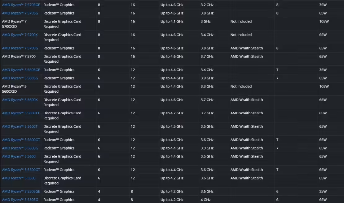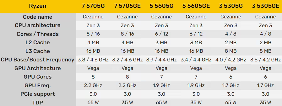 锐龙 5005G 系列仍基于 Cezanne 芯片,采用 ZEN 3 CPU + Vega GPU 的架构设计,包含锐龙 7 5705G(8 核)/ 锐龙 5 5605G(6 核)/ 锐龙 3 5305G(4 核)的标准功耗(65W)与低功耗-E(35W)版本,本质上与最初的锐龙 5000G 系列基本没有区别,例如 5305G、5605G 和 5705G 分别与 5300G、5600G 和 5700G 具有相同的规格。
