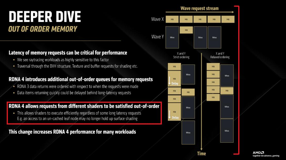 AMD 的 RDNA 4 带来了多种内存子系统的改进。其中一张幻灯片尤为引人注目,因为它涉及乱序内存访问。根据幻灯片内容,RDNA 4 允许来自不同着色器的请求以乱序方式完成,并为内存请求新增了乱序队列。