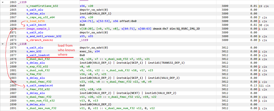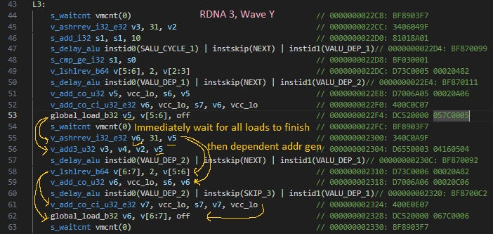 AMD 编译器为波 X 生成的 RDNA 3 汇编代码注释。