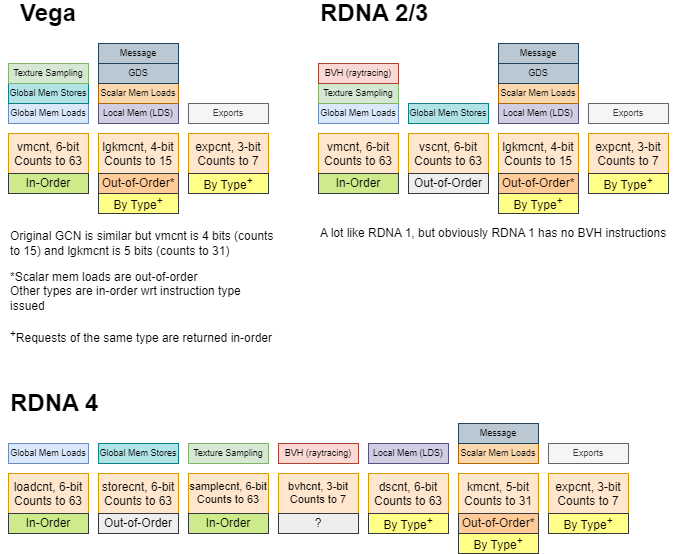 RDNA 4 采用了相同的方案,但将 vmcnt 类别拆分为多个计数器。一个线程可以交错发出全局内存、纹理采样和光线追踪相交测试请求,并分别等待这些请求完成。这让编译器在等待内存访问完成之前,能更灵活地安排工作。对 AMD 幻灯片的另一种解读是,每个计数器对应一个单独的队列,每个队列在不同波之间具有乱序行为(但在一个波内可能是有序行为)。