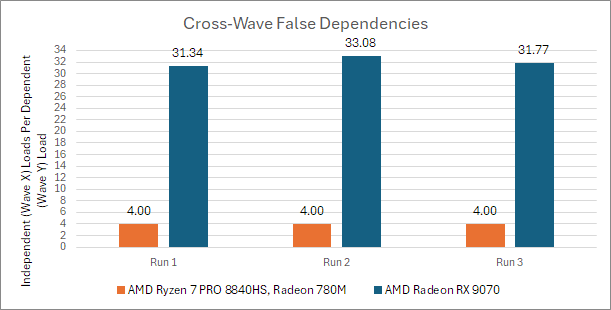 在 RDNA 4 之前,AMD 的内存子系统显然存在一种错误的依赖情况。一个 “波”(wave)可能会等待另一个 “波” 发出的内存加载操作完成。在 GPU 中,“波前”(wavefront)、“波” 或 “线程束”(warp)大致相当于 CPU 线程。它有自己的寄存器状态,并且可以与其他 “波” 不同步运行。每个 “波” 的指令除了极少数情况(如原子操作)外,都与其他 “波” 的指令相互独立。