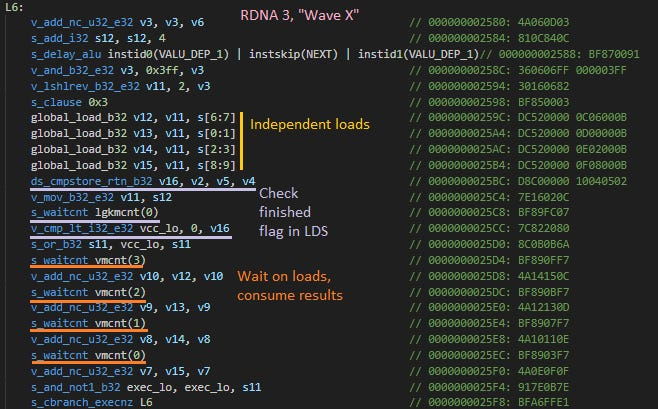 如果波 X 的每次访问都被波 Y 延迟,那么我们应该看到两者的访问次数大致相同。然而在 RDNA 3 上,波 X 的访问次数比波 Y 多,多出的数量恰好是波 X 的循环展开因子。AMD 的编译器会静态调度指令,在等待数据前先发出全部四次访问请求,然后使用 “s_waitcnt vmcnt (...)” 指令等待加载完成。