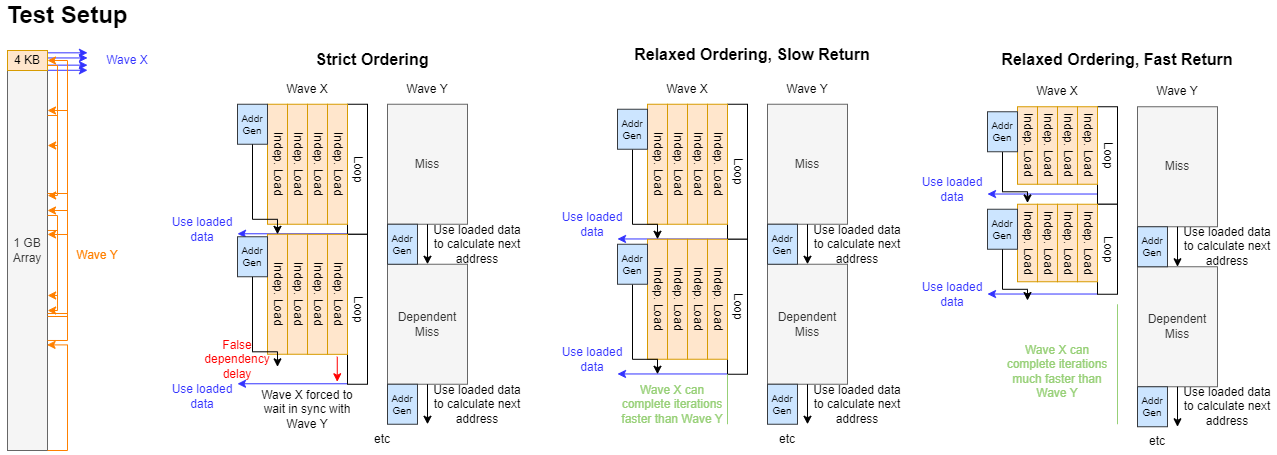 并且不去关注缓存命中和未命中的情况,而是测试一个波在等待内存访问时,是否会错误地等待另一个波的内存访问。测试中,“波 Y” 基本上是一个内存延迟测试,它进行固定次数的访问。每次访问都依赖于前一次访问的结果,并且我们让这个波通过指针追踪一个 1GB 的数组,以确保出现缓存未命中的情况。“波 X” 在每次循环迭代中进行四次独立的内存访问,然后使用加载的数据,这意味着它要等待数据从内存中返回。