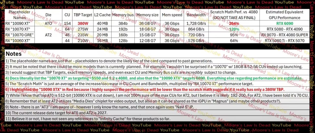 Moore's Law is Dead 频道在最新一期视频中,主播 Tom 分享了关于 AMD Radeon RX 10900 XT 显卡的相关信息,配备 36GB GDDR7 显存,台积电 3nm 工艺,154 个计算单元。