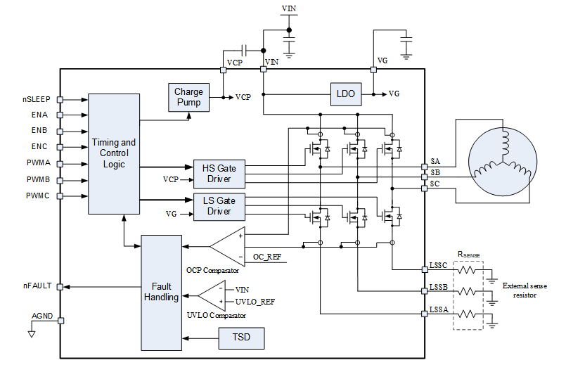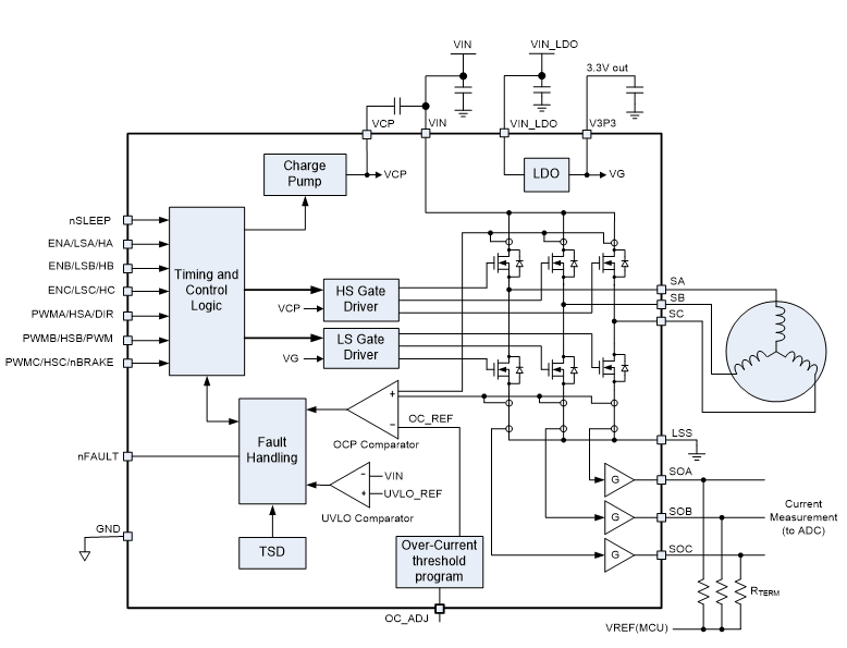 为了便于控制,MP6543支持PWM与ENBL输入,支持霍尔信号输入,内置3.3V/100mA LDO调节器,支持内部充电泵100%占空比工作,具备自动同步整流功能。
