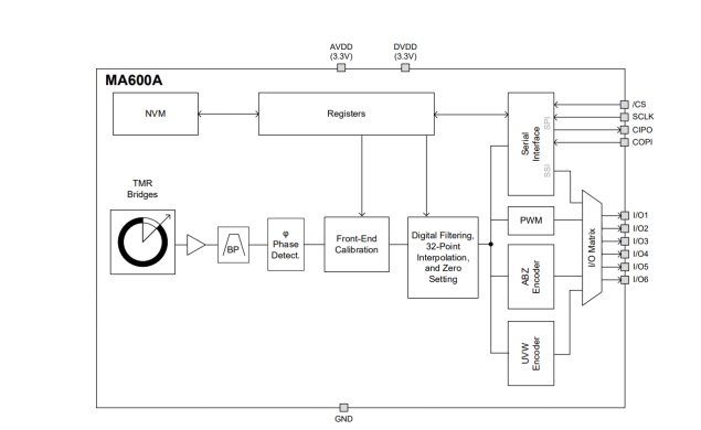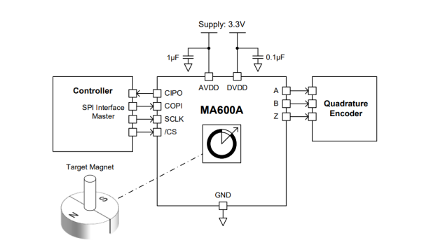 MA600A的工作电压为3V至3.6V,通信接口支持SPI、ABZ、PWM、UVW以及SSI,适用于多种通信协议场合。其支持菊花链配置,配置更加灵活,通过AEC-Q100认证,安全可靠。