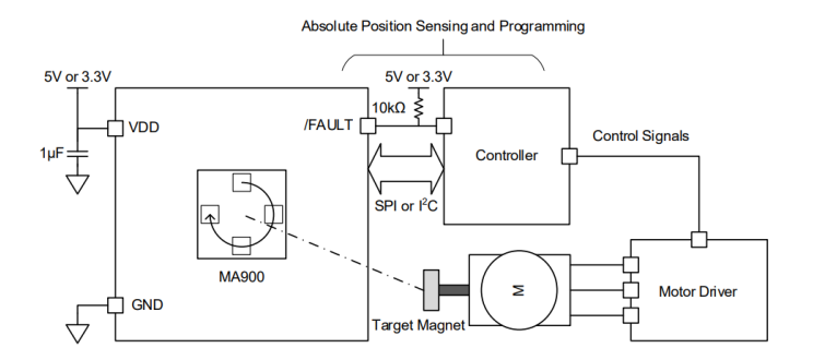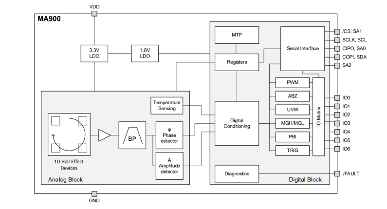 MA900提供两种供电电压,3V至3.6V和4.5V至5V。通信接口支持SPI、I²C、ABZ、PWM、UVW、SSI、SENT,可适配多种电压与通信协议场景。在故障检测方面,MP900还可配置磁场强度检测,便于诊断检查。