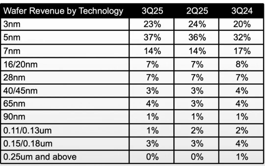 其中,先进制程(定义为7nm及以下技术)合计占总晶圆营收的74%。台积电第三季度 3 纳米制程出货量占总晶圆收入的 23%;5 纳米制程的出货量占 37%;7 纳米制程的出货量占 14%。
