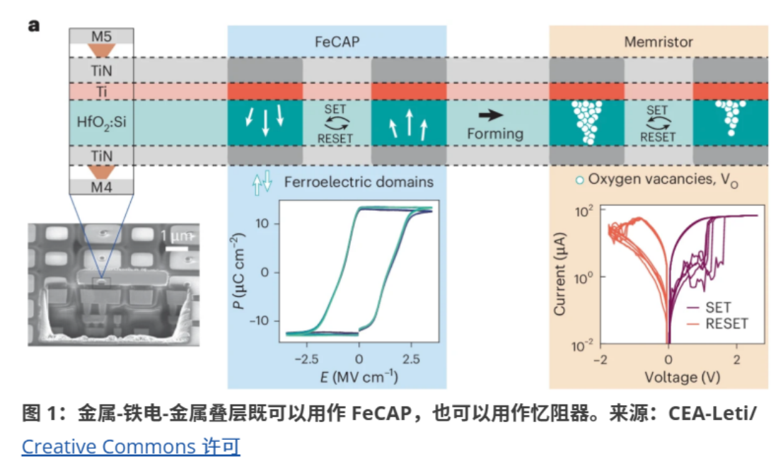 在另一种混合方法中,Martemucci 团队将掺杂硅的 HfO2电容器与钛氧清除层结合到标准 CMOS BEOL 工艺中。这些器件最初表现为铁电电容器,其中一些器件接收一次性“唤醒”脉冲以稳定铁电响应。同时,电容器阵列的另一部分经过一次性“成型”工艺,形成由氧空位构成的导电细丝。钛层充当氧空位储存器,防止细丝溶解。由此产生的忆阻器器件可以在高阻和低阻状态之间切换。
