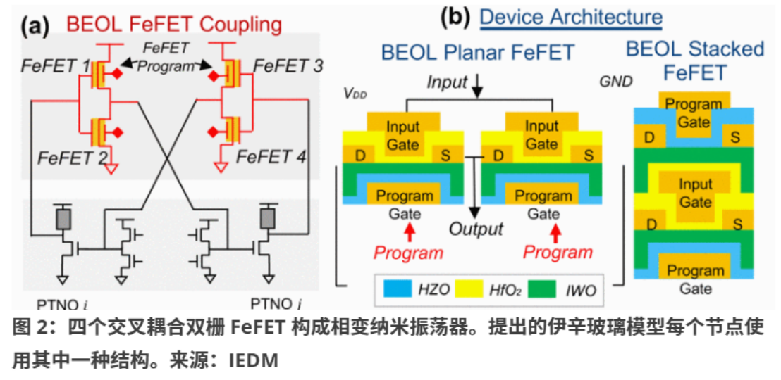 解决伊辛玻璃问题是量子计算最引人入胜的潜在应用之一。更传统的方法是,在去年的IEEE电子设备会议上,德克萨斯大学研究员Tanvir Haider Pantha和他的同事们提出构建一个三维结构,将FeFET融入CMOS逻辑工艺的BEOL(后道工艺)。每个节点由四个交叉耦合的FeFET组成,可以存储一个有符号的模拟值,该值映射到待解决问题的伊辛耦合矩阵。每个节点的输出是其相邻节点的输入,从而在整个网络中建立振荡,最终达到稳定的最小能量配置。