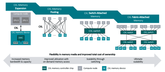 CXL 引入的最具影响力的功能之一是内存池,它允许根据工作负载需求将内存动态分配给不同的设备,而不是静态地绑定到单个 CPU 或 GPU。这消除了闲置容量,并提高了内存资源的利用率。另一个关键特性是分层内存,其中高性能本地 DRAM 可以通过更大的 CXL 连接内存池(例如 DDR5 或持久内存)进行补充,从而实现速度、容量和成本效率的平衡。最后,CXL 是可组合基础设施的基石,其中计算、加速器和内存等资源可以实时组装和重新组装,以满足不断变化的工作负载需求,从训练海量大型语言模型到运行延迟敏感的推理任务。