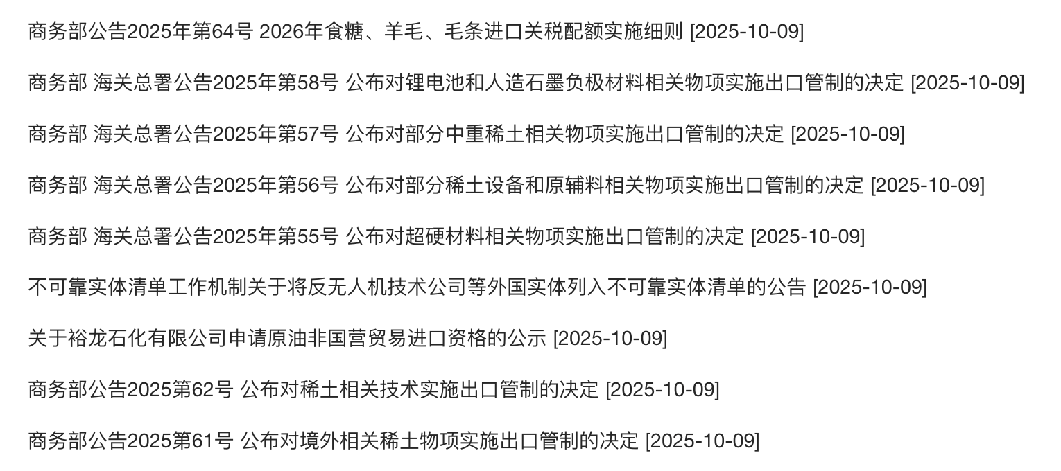 10月9日,商务部发布相关出口管制,涵盖锂电池和人造石墨负极相关材料物项、中重稀土相关物项、稀土设备和原辅料相关物项、超硬材料相关物项、稀土相关技术等。