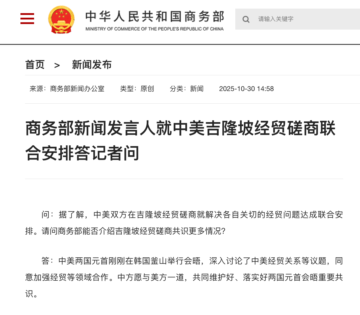 据商务部官网,中美两国元首刚刚在韩国釜山举行会晤,深入讨论了中美经贸关系等议题,同意加强经贸等领域合作。