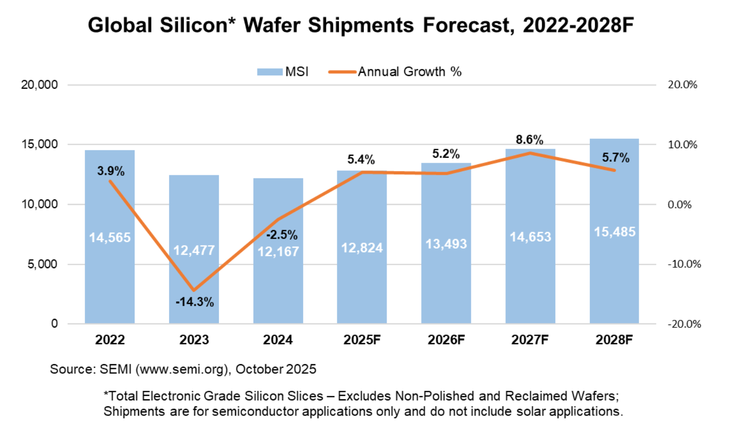 2025年10月28日,SEMI宣布,预计2025年全球硅晶圆出货量将同比增长5.4%,达到128.24亿平方英寸。在人工智能相关产品强劲需求的推动下,这一增长势头将持续,并在2028年达到创纪录的154.85亿平方英寸。