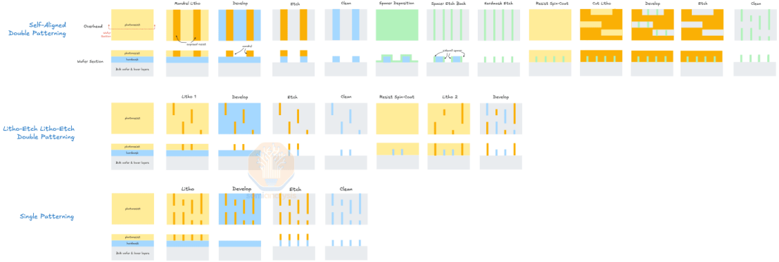 常见多重曝光方案的简化工艺流程。多重曝光除了光刻曝光外,还需要额外的工艺步骤。来源:SemiAnalysis