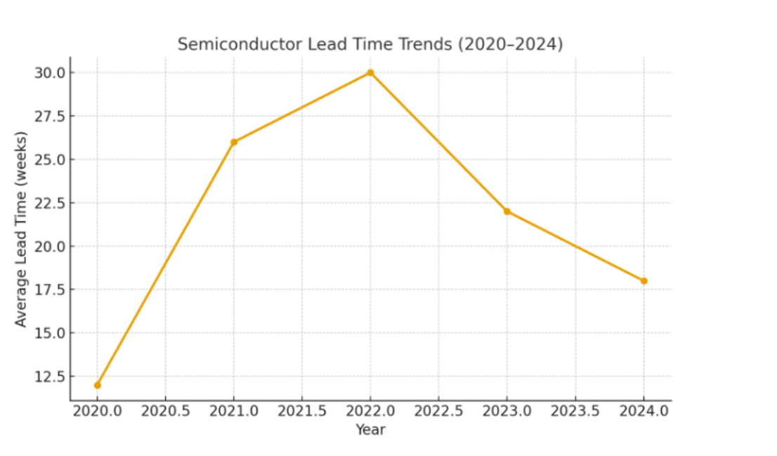 图1. 半导体交货周期从2020年的12周飙升至2022年的30周以上,之后有所缓解。人工智能与量子技术的融合可以通过实现预测分析和多元化采购来帮助稳定这些波动。