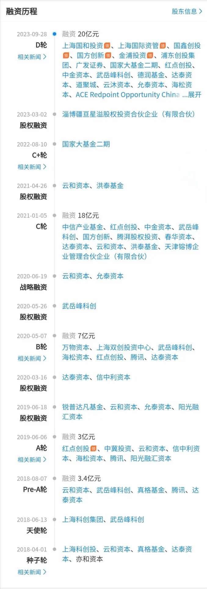 公司成立仅一个月,便获得了种子轮融资;五个月后,又宣布获得由腾讯领投的3.4亿元Pre-A轮融资。此后,融资如潮水般涌来,红杉中国、国家大基金二期、CPE源峰等机构接连入场。