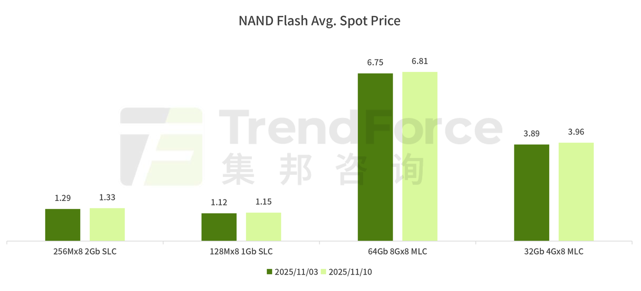 而NAND Flash得益于合约市场强势拉动,现货市场氛围进一步升温,价格上涨幅度及报价频率均显著增加。由于中小型买家难以通过原厂取得货源,转向现货市场采购的需求明显增温。然而,现货供应相对稀缺,持货商普遍看好后市走势,延后出货、惜售情绪浓厚,导致成交量有限但价格持续上扬。