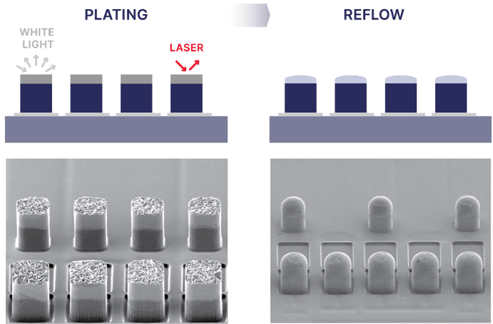 鉴于这些挑战的广泛性,IC制造商通常专注于在电镀步骤之后和回流焊步骤之前识别问题。在铜和锡帽电镀后,共聚焦激光检测优于白光检测,因为粗糙金属表面的反射会导致测量噪声。