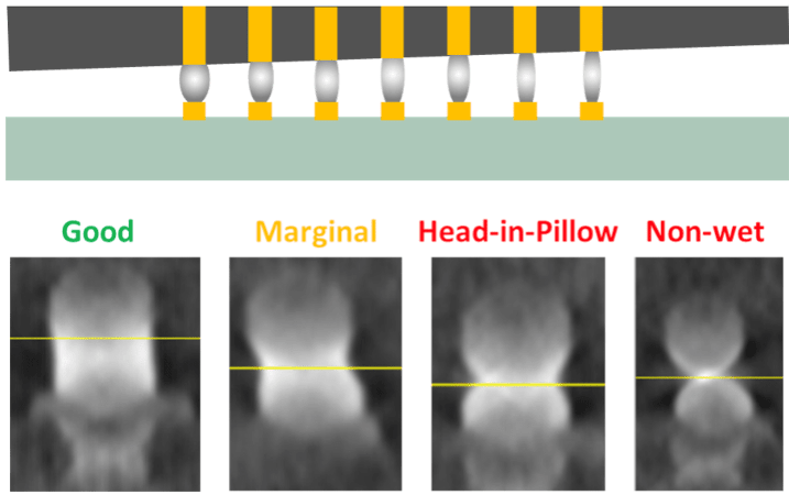 微凸块会遭受各种类型的缺陷,包括焊料颈缩、枕头效应和部分裂纹。枕头效应是一种潜在缺陷,其中一个焊球似乎陷入了下面的另一个焊球中,就像头枕在枕头上一样。一旦受到热应力或机械应力,就可能发生润湿不良故障。X射线成像在识别由晶圆倾斜引起的凸块未对准所导致的枕头效应等边缘故障方面,可以发挥重要作用。