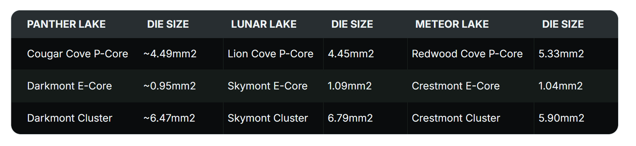 Panther Lake 与 Lunar Lake、Meteor Lake 核心裸片面积对比: