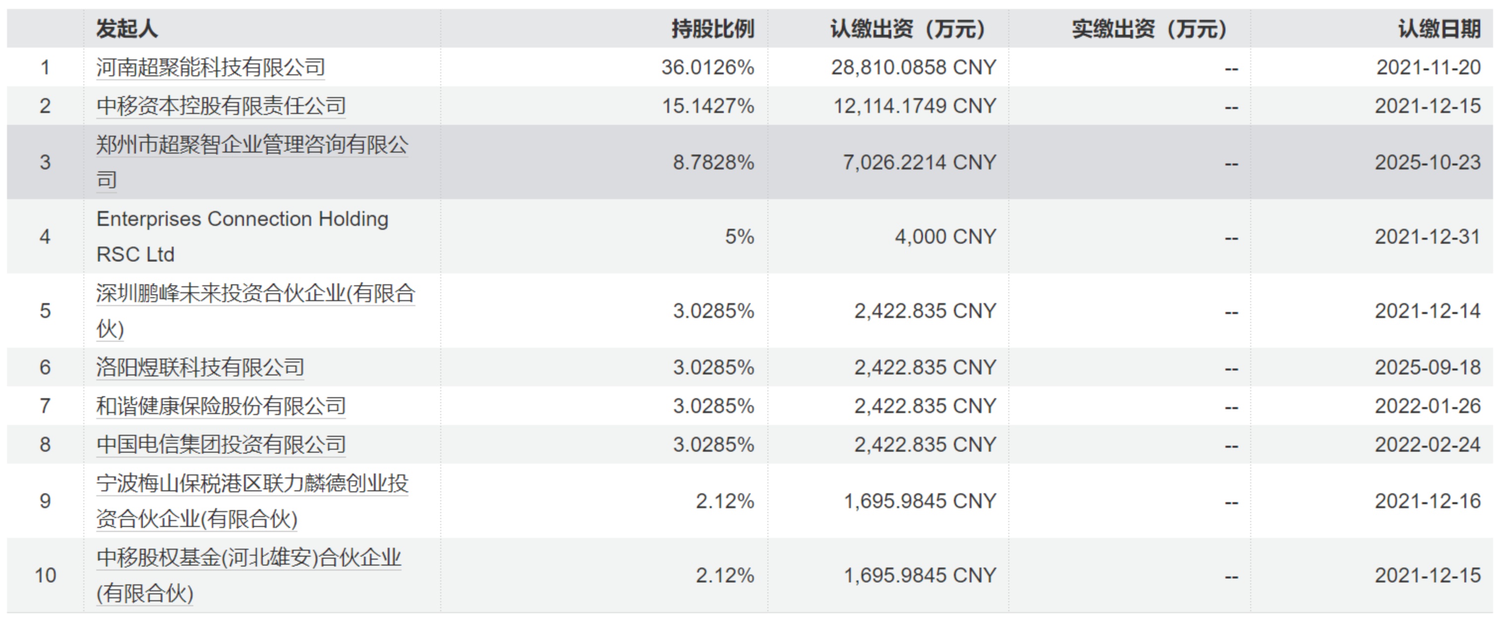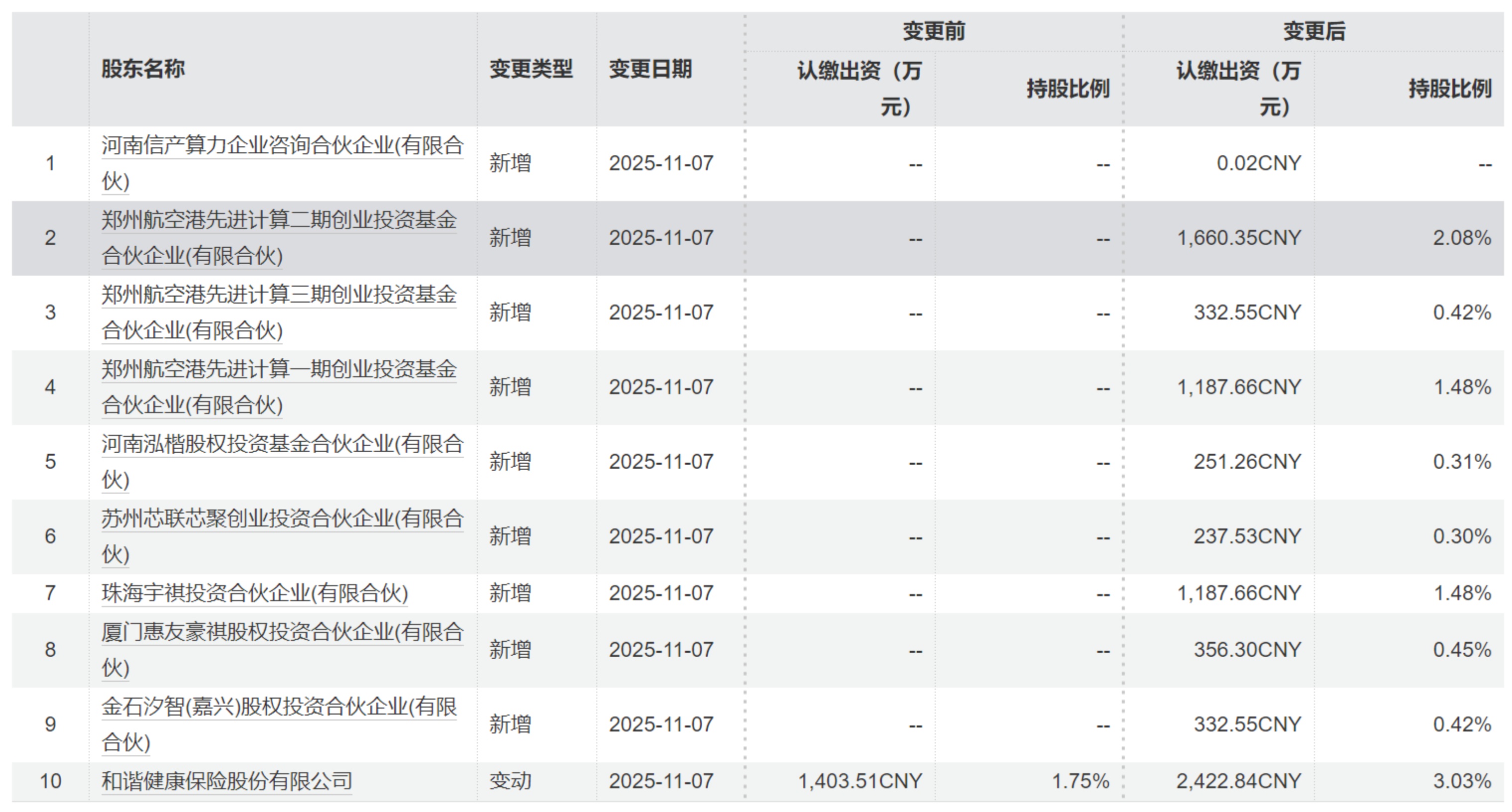 11月7日,超聚变完成新一轮投资人变更。新进股东包括郑州航空港先进计算一期创业投资基金合伙企业(有限合伙)、郑州航空港先进计算二期创业投资基金合伙企业(有限合伙)、郑州航空港先进计算三期创业投资基金合伙企业(有限合伙)、河南泓楷股权投资基金合伙企业(有限合伙)、金石汐智(嘉兴)股权投资合伙企业(有限合伙)、厦门惠友豪祺股权投资合伙企业(有限合伙)、苏州芯联芯聚创业投资合伙企业(有限合伙)等机构。同时,多家老股东在本轮追加了投资。