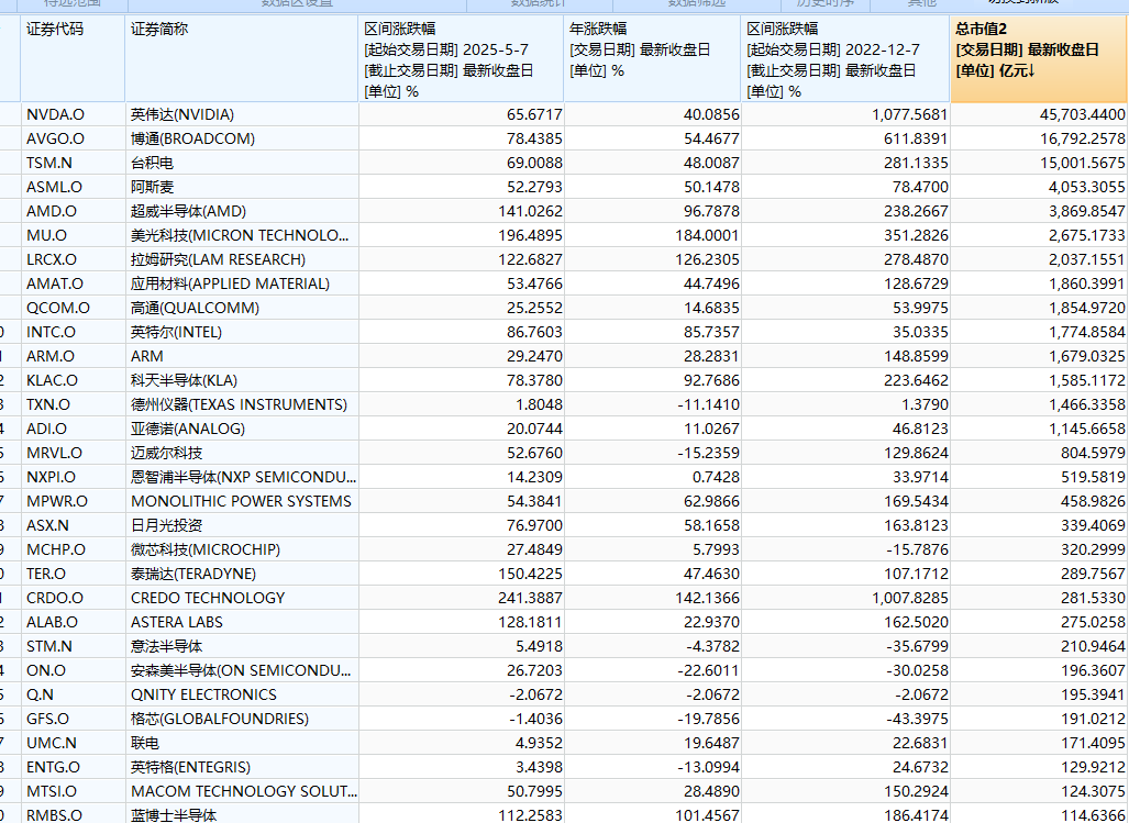 一是晶圆处理设备,主要是ASML、应用材料、拉姆研究和科磊,整体涨幅都没到很高,但是近期表现都不错,但又没有像存储公司那么亮眼。