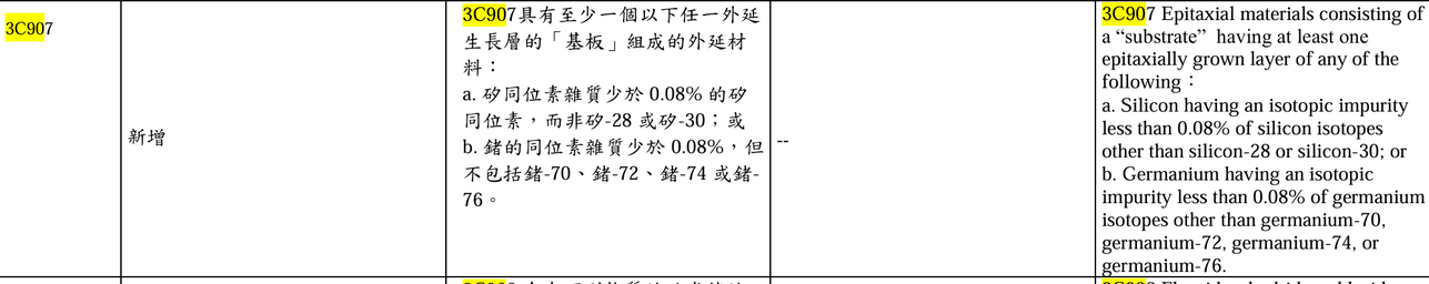 修正条目3C907为新增,3C907 具有至少一个以下任一外延生长层的「基板」组成的外延材料:a. 硅同位素杂质少于 0.08% 的硅同位素,而非硅 - 28 或硅 - 30;或b. 锗的同位素杂质少于 0.08%,但不包括锗 - 70、锗 - 72、锗 - 74 或锗 - 76。