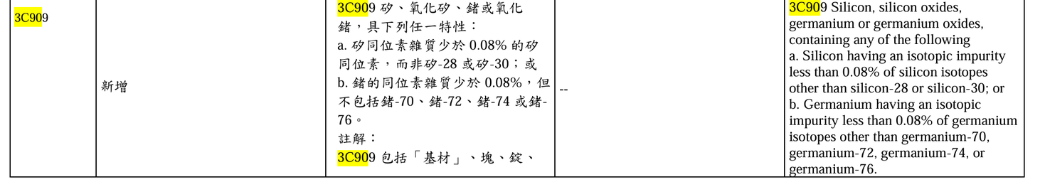 修正条目3C909为新增,3C909 硅、氧化硅、锗或氧化锗,具备下列任一特性:a. 硅同位素杂质少于 0.08% 的硅同位素,而非硅 - 28 或硅 - 30;或b. 锗的同位素杂质少于 0.08%,但不包括锗 - 70、锗 - 72、锗 - 74 或锗 - 76。
