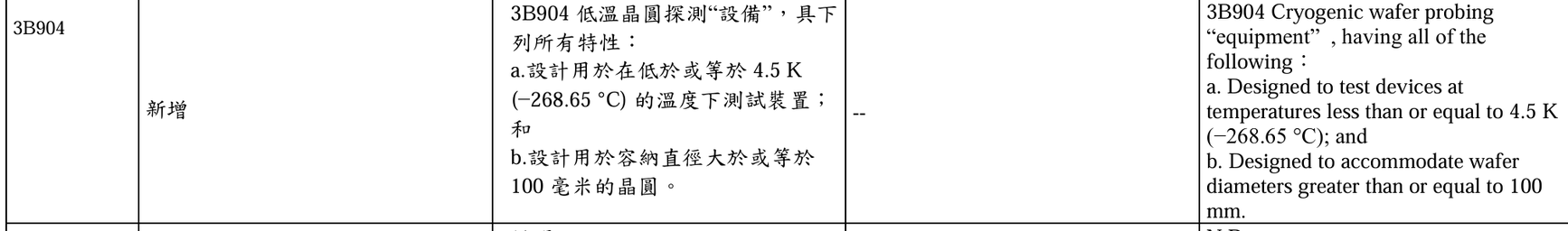修正条目3B904为新增,3B904低温晶圆探测 “设备”,具备下列所有特性:a. 设计用于在低于或等于 4.5 K(-268.65 °C)的温度下测试装置;和b. 设计用于容纳直径大于或等于 100 毫米的晶圆。