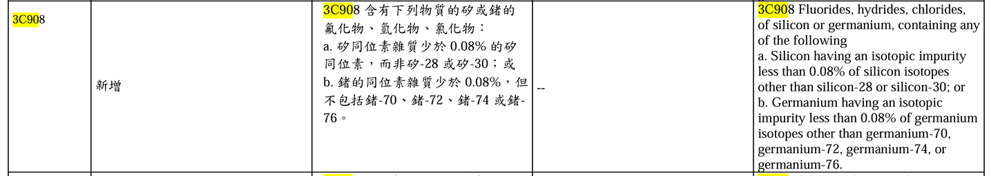 修正条3C908 为新增,3C908 含有下列物质的硅或锗的氟化物、氢化物、氯化物:a. 硅同位素杂质少于 0.08% 的硅同位素,而非硅 - 28 或硅 - 30;或b. 锗的同位素杂质少于 0.08%,但不包括锗 - 70、锗 - 72、锗 - 74 或锗 - 76。