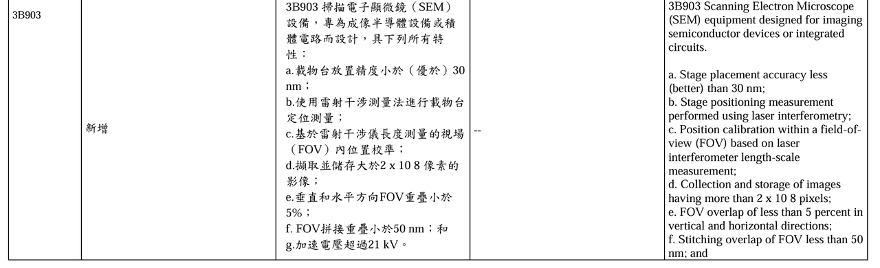 修正条目3B903为新增,3B903扫描电子显微镜(SEM)设备,专为成像半导体设备或集成电路而设计,具备下列所有特性:a. 载物台放置精度小于(优于)30 nm;b. 使用激光干涉测量法进行载物台定位测量;c. 基于激光干涉仪长度测量的视场(FOV)内位置校准;d. 撷取并储存大于 2×10⁸像素的影像;e. 垂直和水平方向 FOV 重叠小于 5%;f. FOV 拼接重叠小于 50 nm;和g. 加速电压超过 21 kV。
