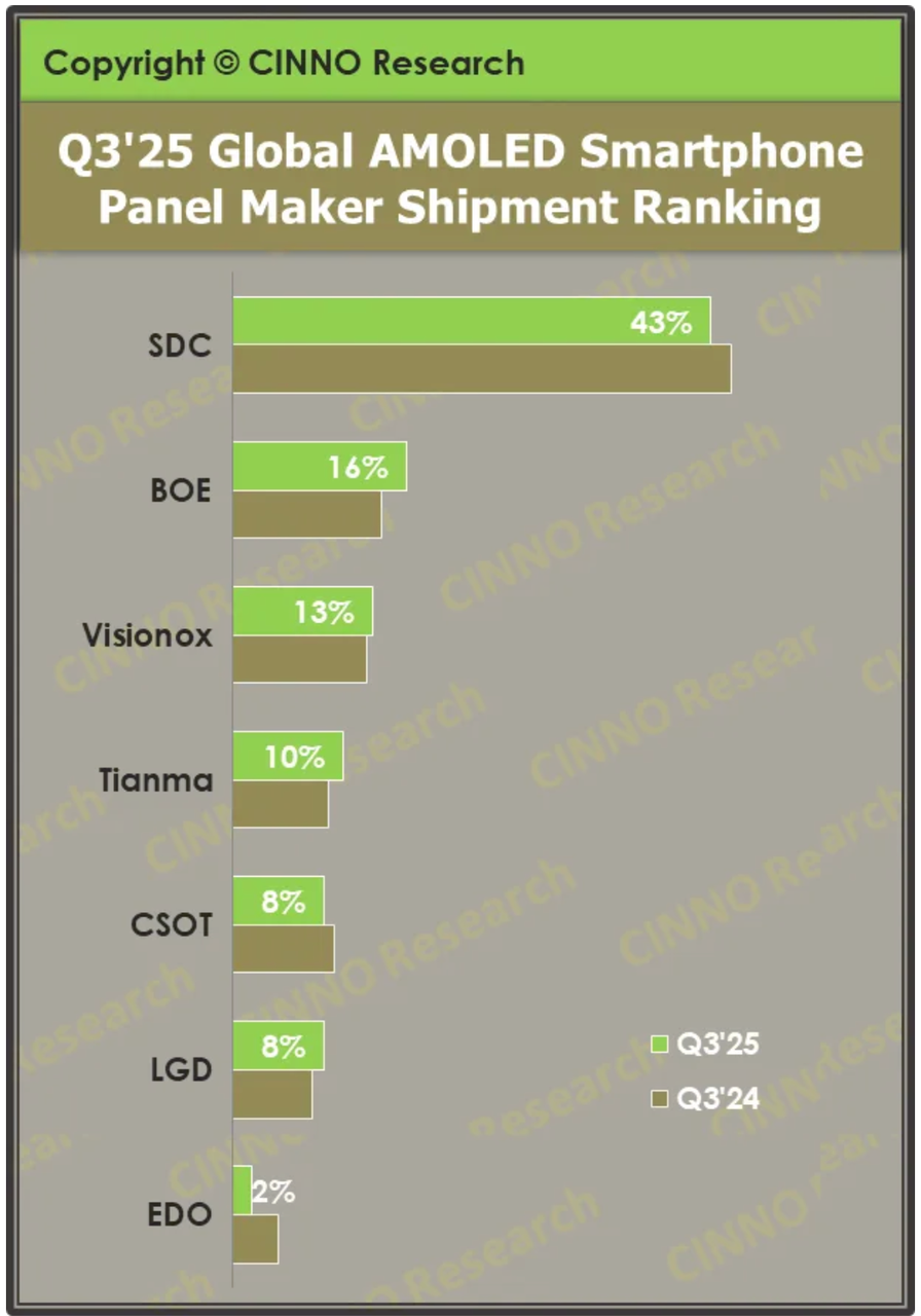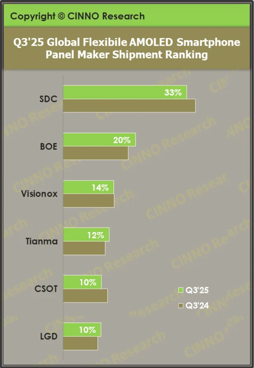 2025年第三季度,三星显示(SDC)柔性AMOLED智能手机面板出货量同比增长9.3%,环比增长40.4%,市场份额33.5%,同比下滑2.3个百分点,主流厂商份额同比下滑最大,持续面临来自国内厂商的竞争压力;