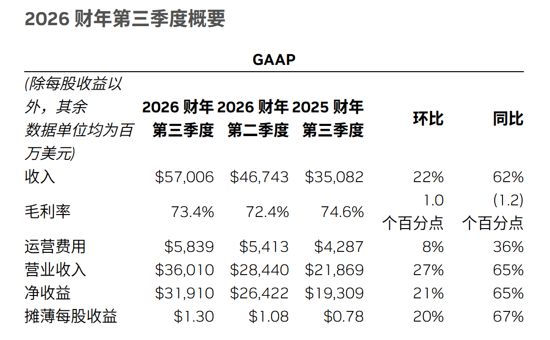 财报显示,英伟达2025年第三季度(截至10月26日)营收570.1亿美元,高于市场普遍预期的约550亿美元,创下历史新高,环比增长22%,同比增幅达62%。其中,公司三季度数据中心营收达512亿美元,同比增长66%。此外,本季度公司GAAP和非GAAP口径下毛利率分别为73.4%和73.6%。GAAP和非GAAP的摊薄每股收益均为1.30美元。