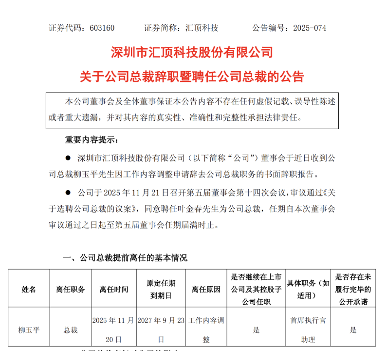 2025年11月22日,汇顶科技公告,叶金春先生新任总裁。资料显示,叶金春,男,1984年2月出生,中国籍,无境外永久居留权,中南大学通信工程专业本科学历。2007年加入深圳市汇顶科技股份有限公司,历任深圳市汇顶科技股份有限公司触控系统软件工程师、项目经理、生物识别产品开发部负责人、中国区研发部负责人、安全事业部负责人、触控与无线连接事业部负责人、副总裁,现任深圳市汇顶科技股份有限公司总裁。