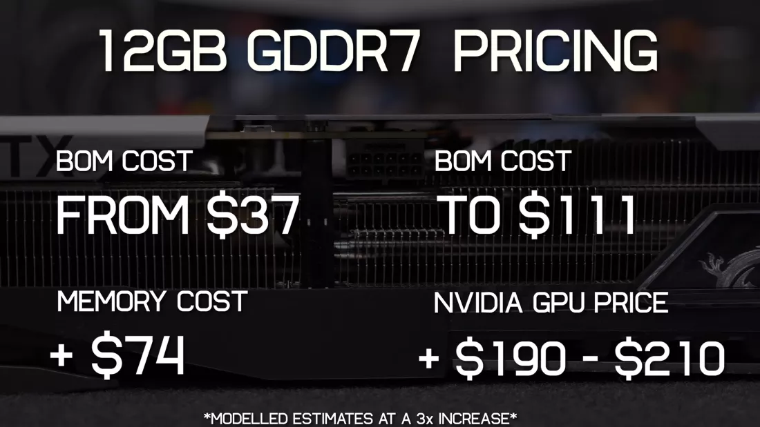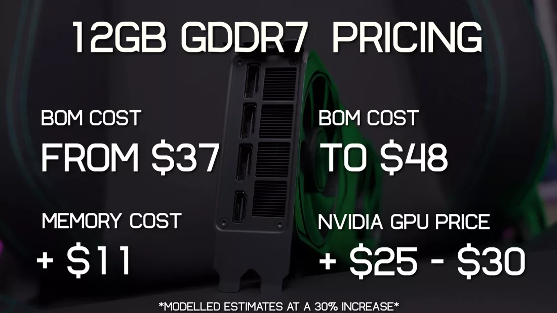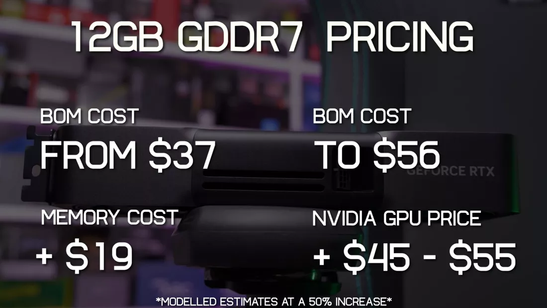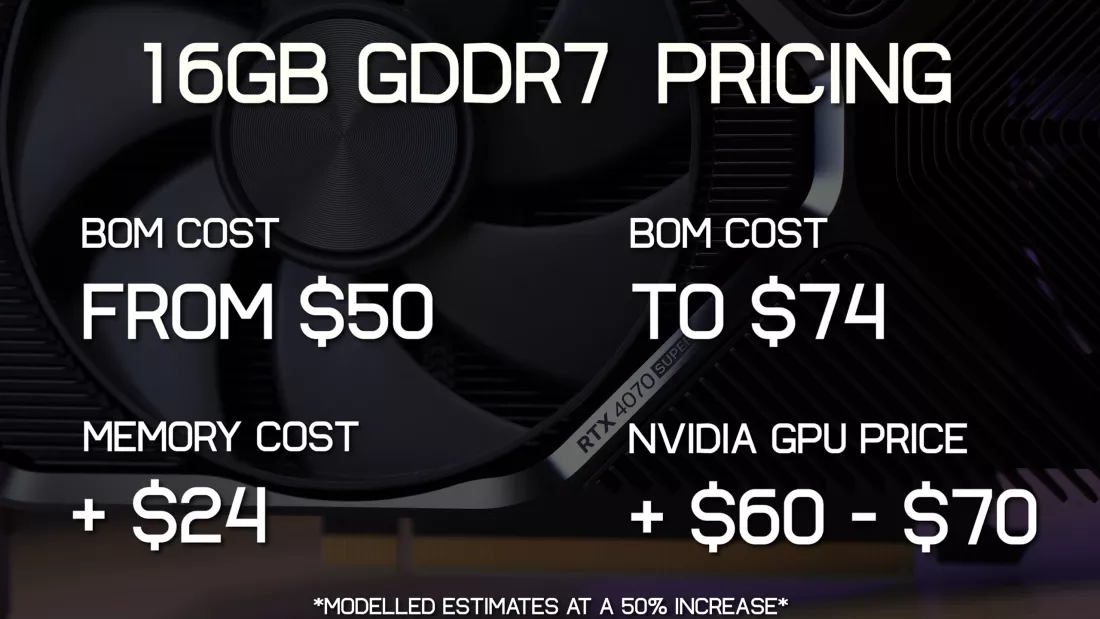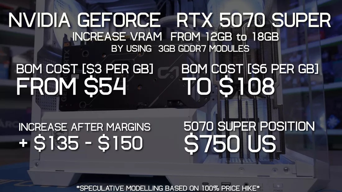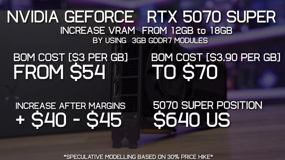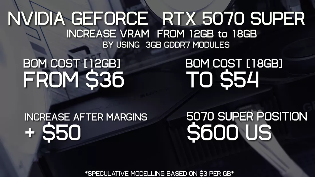 以传闻中的 RTX 5070 Super 为例,据说它今年早些时候将通过使用 3GB GDDR7 显存模块,把显存容量从 12GB 提升到 18GB。在 GDDR7 显存价格约为每 GB 3 美元的情况下,从 12GB 提升到 18GB 将使显存物料清单成本从大约 36 美元增加到大约 54 美元。