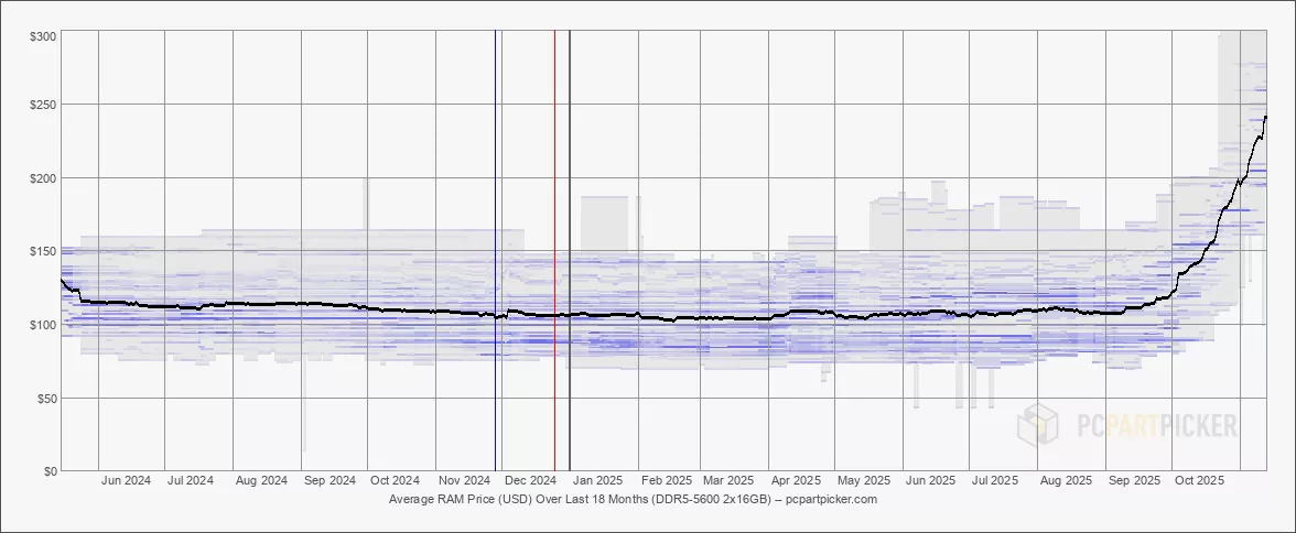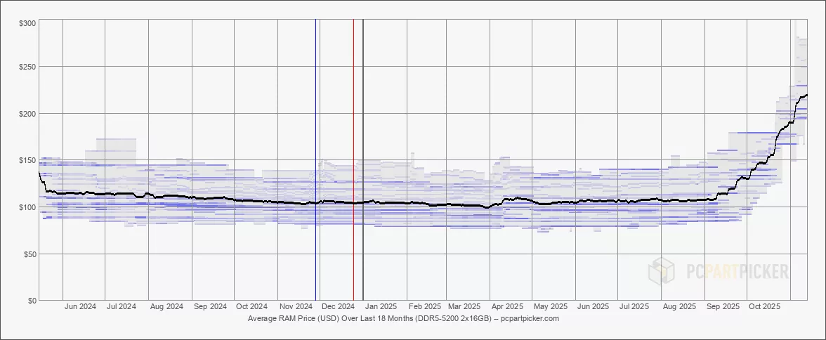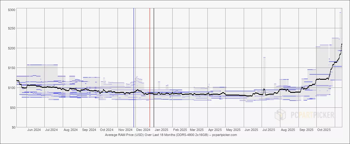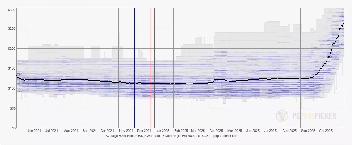 所有DDR5内存套装的价格都大幅上涨,尤其是我们通常推荐的32GB DDR5-6000套装。根据PC Part Picker的数据,这些套装今年大部分时间的平均价格在125美元左右,而现在已经超过250美元。